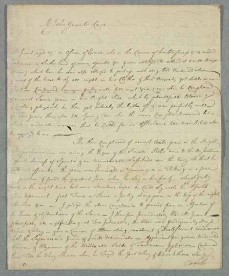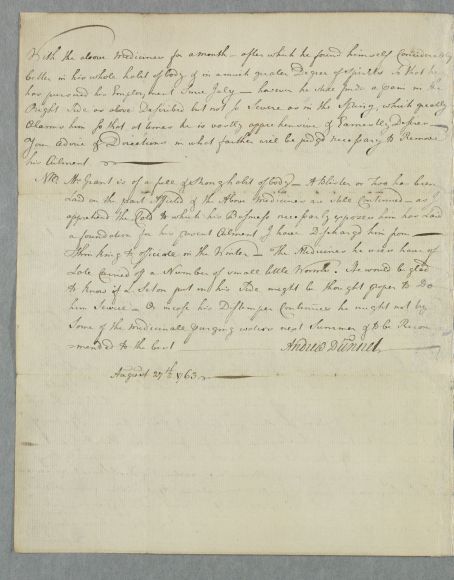 | Summary | Letter from Andrew Dunnet titled 'John Grant's Case'. Mr Grant, an excise officer, became ill several years ago after poor accomodation in Sutherland when he seized some spirits there. |