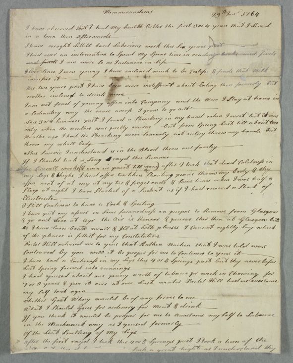 | Summary | Letter from unnamed patient titled 'Memmorandoms', describing his own case. Possibly delivered as an enclosure or by hand prior to a consultation meeting. Writer mentions pain and twitching in his fingertips and toes, and informs Cullen that he is moving from Glasgow to Ayr and has been advised by Dr Hill to use a 'bather machin that I was told was Contraved by you'. Verso carries two, presumably unrelated, additions in other hands; a small diagrammatic drawing and a mathematical calculation. |