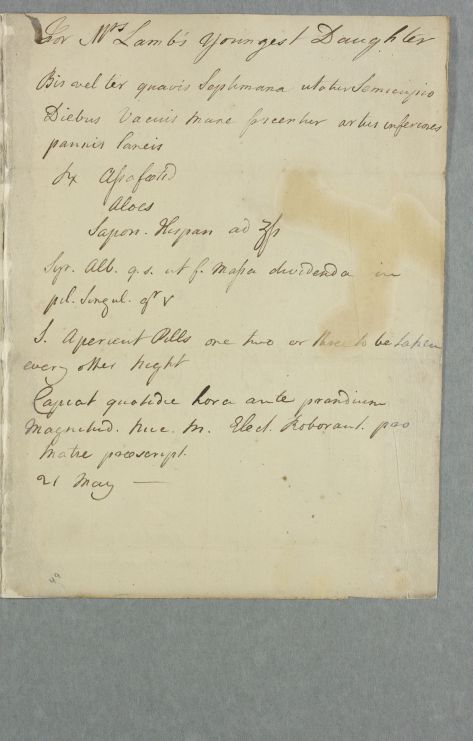 Take half a drachm each of Asafoetida, Aloes, and Spanish Soap, and a sufficient quantity of White Syrup. Make a mass and divide into pills of five grains each. Label: Aperient Pills, one, two or three to be taken every other night. Take daily an hour before dinner [in the permitted?] quantity {illeg} [and make?] a Roborant Electuary. as set-out in the recipe for the mother.