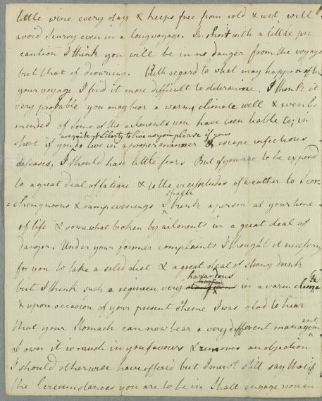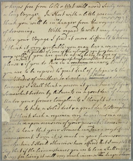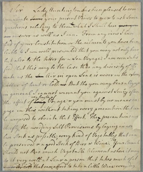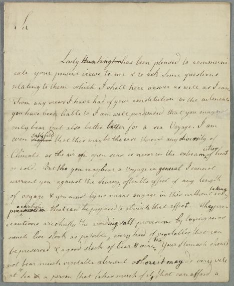 | Summary | Letter by Cullen to 'J. M.' concerning the patient's own case, mentioning that Lady Huntington had previously written about the case. He gives dietary recommendations and suggests a sea voyage. Two drafts of the same letter. |