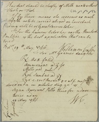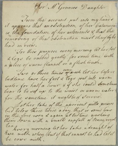 | Summary | Letter by Cullen titled 'For Mr Grames Daughter', whose condition as Cullen sees it arises from 'an obstruction of her Catamenie'. Includes a recipe for 'aperient pills'. |