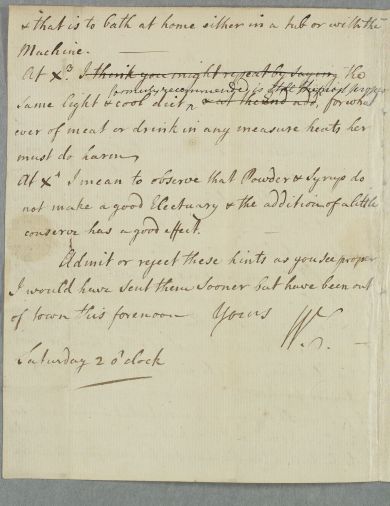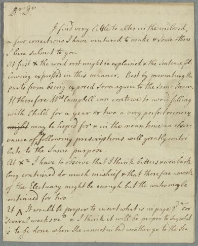 Reply, in form of a corrected, retained draft, in Cullen's own hand addressed to Dr Hope regarding the case of Mrs Campbell, who has suffered from a number of miscarriages. Cullen is offering his suggestions for revising their co-written directions, using a system of crosses etc. to indicate the points in the draft document where these revisions might be made. It is the cover-note for Letter 792, which is the marked-up draft of their co-signed set of directions.