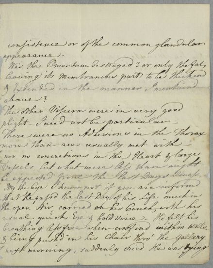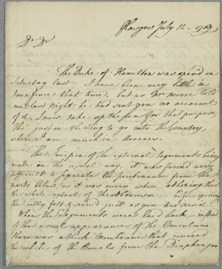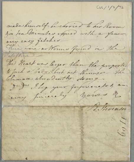 | Summary | Letter from Alexander Stevenson giving an autopsy report on the young Duke of Hamilton. The post-mortem was performed by the surgeon (poet and writer) John Moore who was attached to the Hamilton household and wrote an epitaph. |