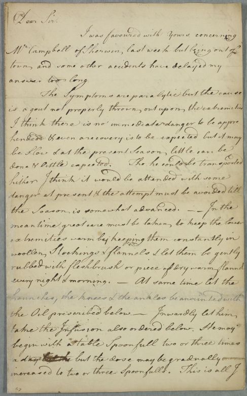 | Summary | Reply from Cullen, in the form of a loose, retained autograph draft. concerning the case of Mr Campbell of Sherwin who is diagnosed with gout. Includes two substantial recipes. |