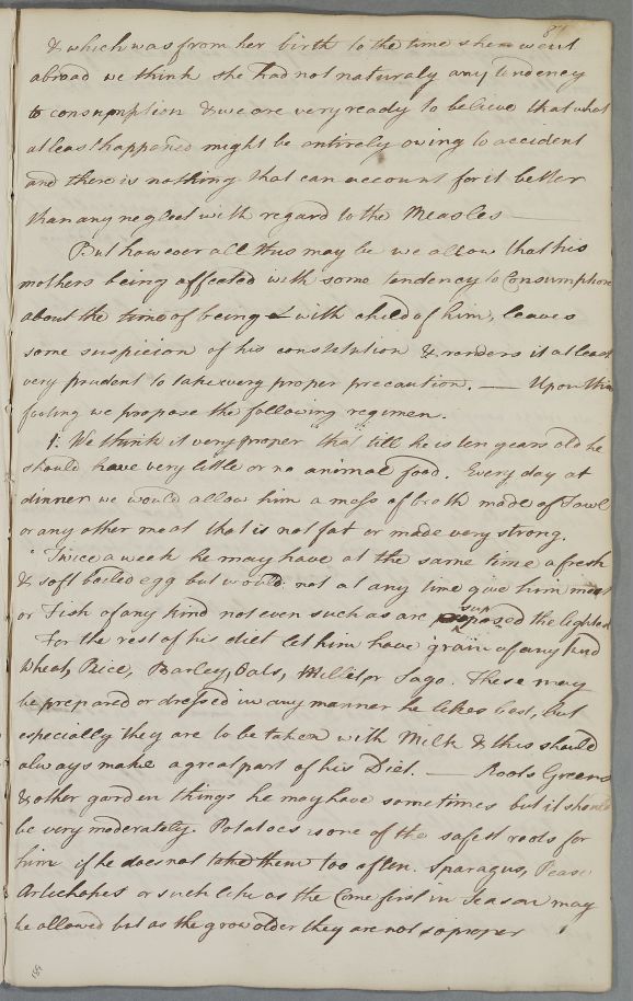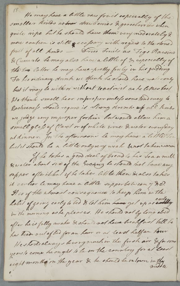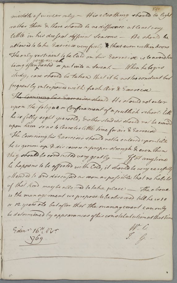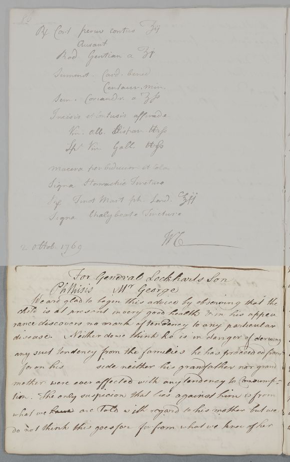 | Summary | Reply, 'For General Lockharts Son Mr George'. Gives a regimen and other detailed advice for maintaining the boy;s health and even advise son schooling. Signed by Cullen and "I.(?)G.". It can be safely assumed that this consultant was Cullen's academic colleague Dr John Gregory. |