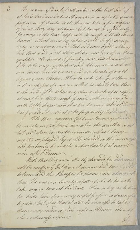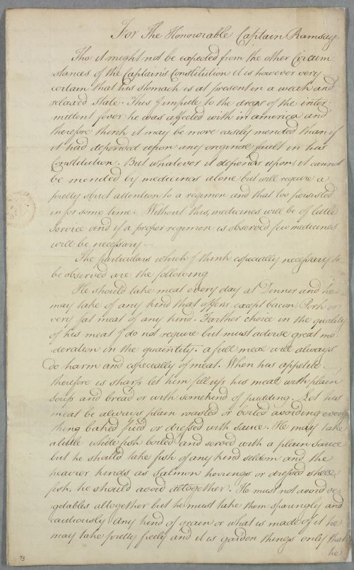 Reply, with regimen and recipes for Hon. Captain Malcolm Ramsay, whose digestion has been affected by contracting "intermitting fever" (malaria) when he served in America. Very neat retained copy in Cullen's own hand.