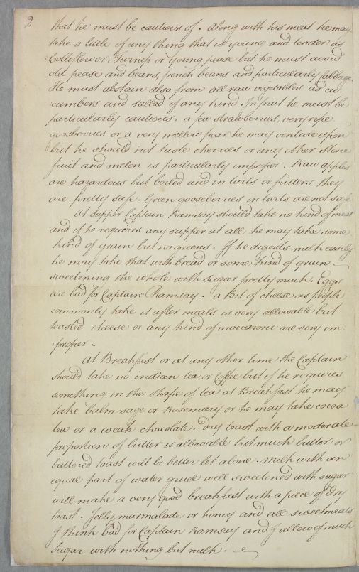| Summary | Reply, with regimen and recipes for Hon. Captain Malcolm Ramsay, whose digestion has been affected by contracting "intermitting fever" (malaria) when he served in America. Very neat retained copy in Cullen's own hand. |