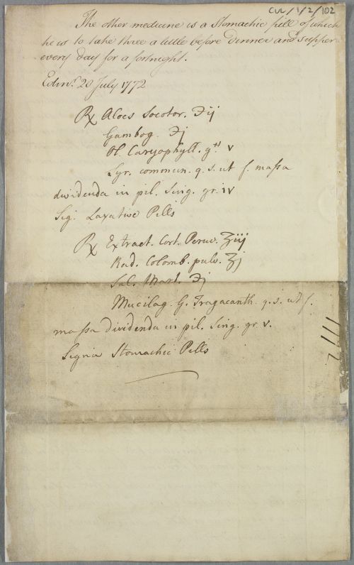 [ID:835] From: Dr William Cullen (Professor Cullen) / To: Dr John Stevenson (in Arbroath) / Regarding: Captain Malcolm Ramsay (Patient) / 20 July 1772 / (Outgoing)