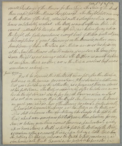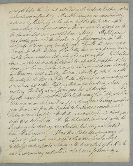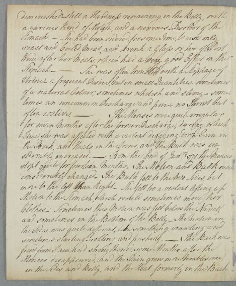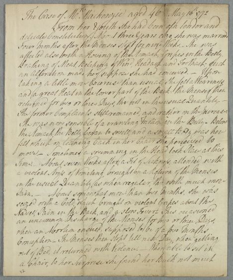 | Summary | Case of Mrs Mackenzie, containing a history of her illness from May of 1772 with an update from June of 1773. Possibly incomplete. She has had an 'abortion" (i.e. miscarriage) and continues to suffer from a variety of very closely detailed stomach and abdominal pains. |