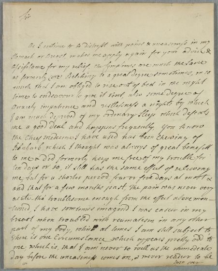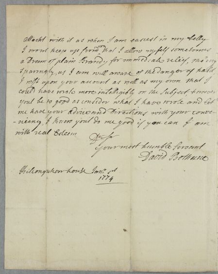 | Summary | Letter from David Bethune relating his own case; he has suffered from 'Belching to a great degree sometimes, or so much that I am obliged to rise out of bed in the night time'. |