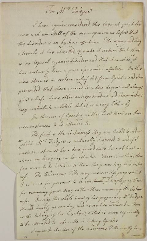 Reply with of directions for Mrs Fordyce in the form of a retained, loose corrected draft in Cullen's own hand Cullen believes that 'the disorder is an hysteric affection'.