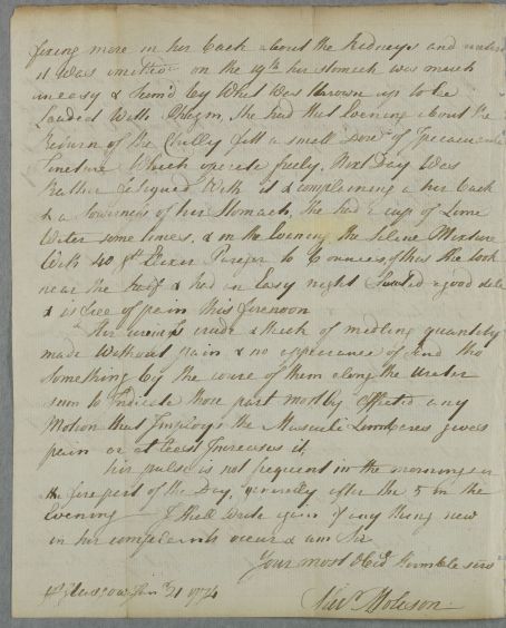 Letter from Alexander Molison regarding the case of Mrs Anne Burrow, who has been suffering from vomiting and pains in her abdomen.
