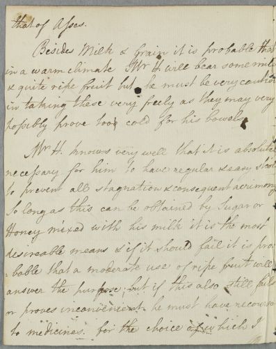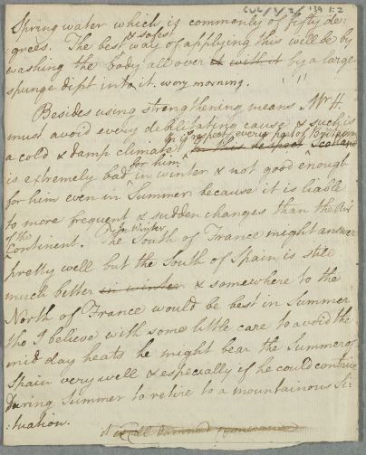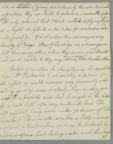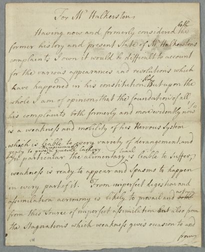 | Summary | Reply, giving detailed directions for Mr Halkerston in the form of a loose, corrected draft in Cullen's own hand. Cullen believes that 'the foundation of all his complaints both formerly and more evidently now is a weakness and mobility of his Nervous system'. The polished version of this response would have been supplied around the time Haggerston consulted Cullen in person as indicated in the other letter linked to this case. |