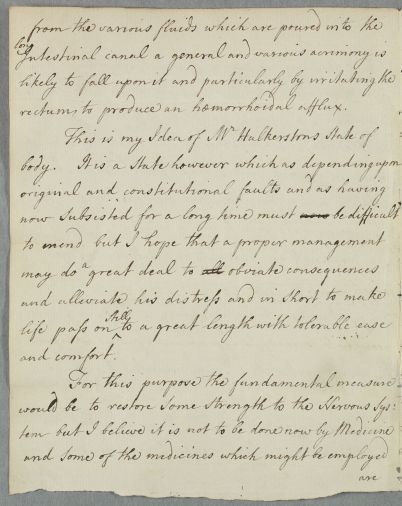 Reply, giving detailed directions for Mr Halkerston in the form of a loose, corrected draft in Cullen's own hand. Cullen believes that 'the foundation of all his complaints both formerly and more evidently now is a weakness and mobility of his Nervous system'. The polished version of this response would have been supplied around the time Haggerston consulted Cullen in person as indicated in the other letter linked to this case.