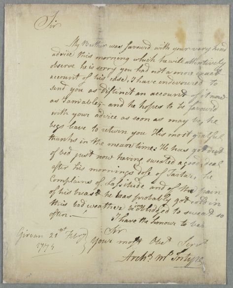 [ID:880] From: Archibald McIntyre / To: Dr William Cullen (Professor Cullen) / Regarding: Mr McIntyre (Patient) / 21 February 1774 / (Incoming)