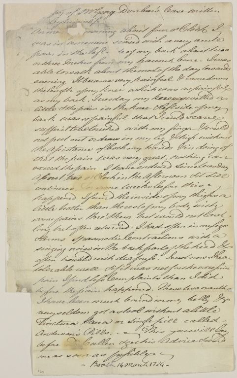 Letter from George Dunbar relating his own case, which concerns a severe pain in his back. Probably sent as an enclosure but no cover letter from Dunbar's local practitioner traced.