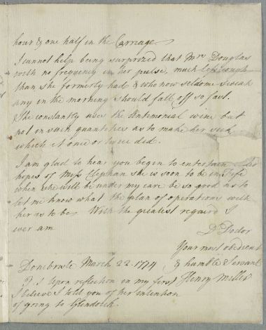 [ID:893] From: Henry Miller / To: Dr William Cullen (Professor Cullen) / Regarding: Mrs Cecilia Douglas (Craigie) (of Strathendry) (Patient), Miss Amelia Clephane (Clephan) (Patient) / 22 March 1774 / (Incoming)