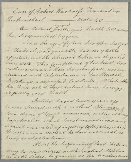 | Summary | 'Case of Robert Harkness, Tennant in Kirkmichael', who has suffered from various illnesses over the past six or seven years composed by Richard Allen. Enclosed with document ID:902. |