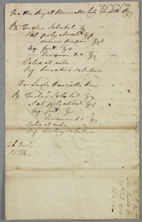 [ID:904] From: Dr William Cullen (Professor Cullen) / To: [ADDRESSEE UNKNOWN] / Regarding: Lady Charlotte Hay (Hay) (Patient), Lady Henrietta Jane Hay (Harriet) (Patient) / 26 July 1774 / (Outgoing)