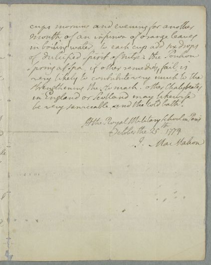 | Summary | Letter from J. (Jean-Baptiste de) MacMahon at the Royal Military School, Paris, concerning the illness of a Mr MacArthur. Cullen not linked as addressee as this may have been originally drawn up for another party. |