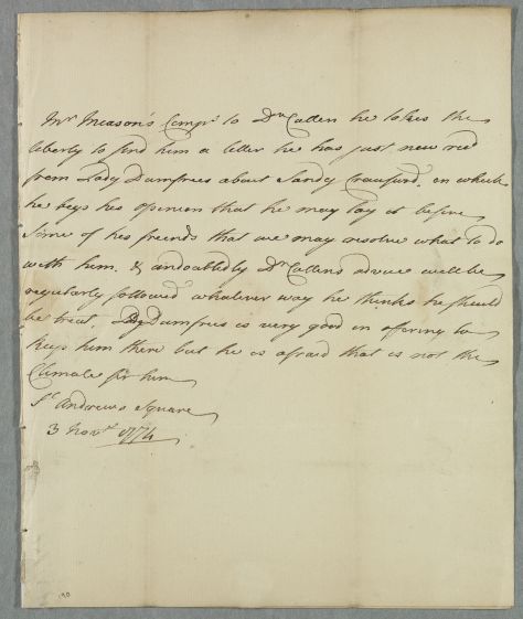 [ID:929] From: Mr Gilbert Meason (of Mordun) / To: Dr William Cullen (Professor Cullen) / Regarding: Mr Alexander Crawfurd (Sandy, Crawford) (Patient) / 3 November 1774 / (Incoming)