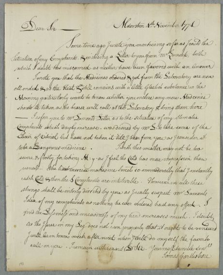 | Summary | Letter from James Garthshore of Alderston regarding the continuing progress of his stomach complaint and asking for medicines to be ordered at 'the Laboratory' (see footnote). |