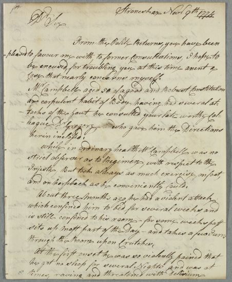 [ID:934] From: Dr Ivie Campbell / To: Dr William Cullen (Professor Cullen) / Regarding: Mr Campbell (Patient) / 9 November 1774 / (Incoming)
