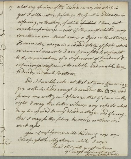 Letter from Dr Ivie Campbell in Stroneskar, regarding the case of Mr Campbell. Campbell also sends as an enclosure a copy of directions provided by the late Dr John Gregory (see document ID:935), and it is this other document which bears the posting information.