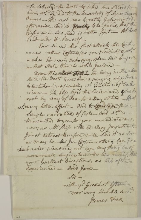 Letter from James Fea on the case of Andrew Ross, who is delirious and suffers attacks of pain but whose condition seems to be improving. Gives a diary of the progress of the illness and course of treatment.