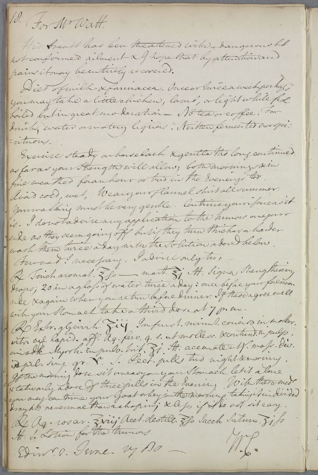 | Summary | Reply 'For Mr Watt', whose 'breast has been threatened with a dangerous but not confirmed ailment'. Cullen mentions the 'tumours on your side' and recommends continuing goat whey. |