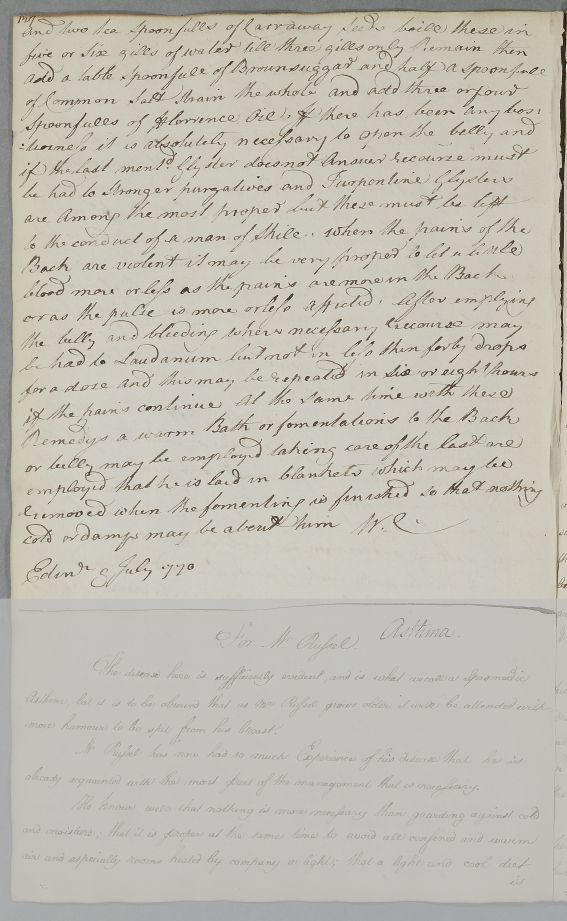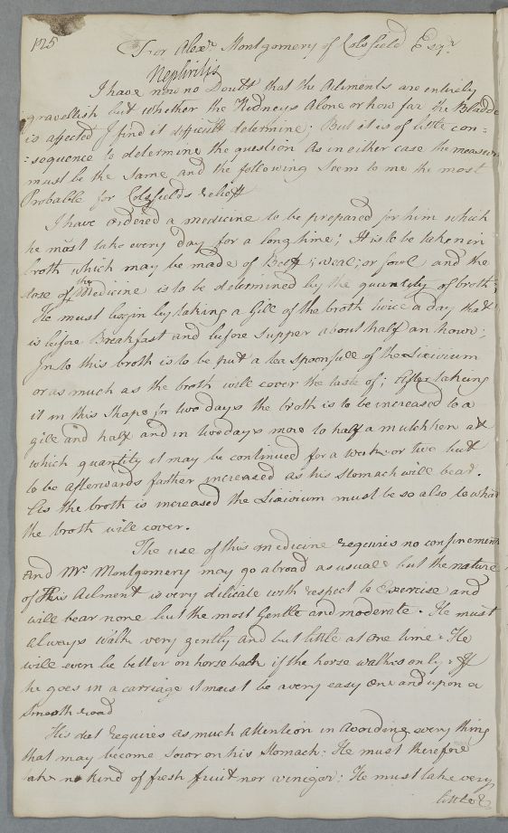 [ID:98] From: Dr William Cullen (Professor Cullen) / To: [ADDRESSEE UNKNOWN] / Regarding: Mr Alexander Montgomerie (Montgomery; of Coylesfield) (Patient) / 9 July 1770 / (Outgoing)